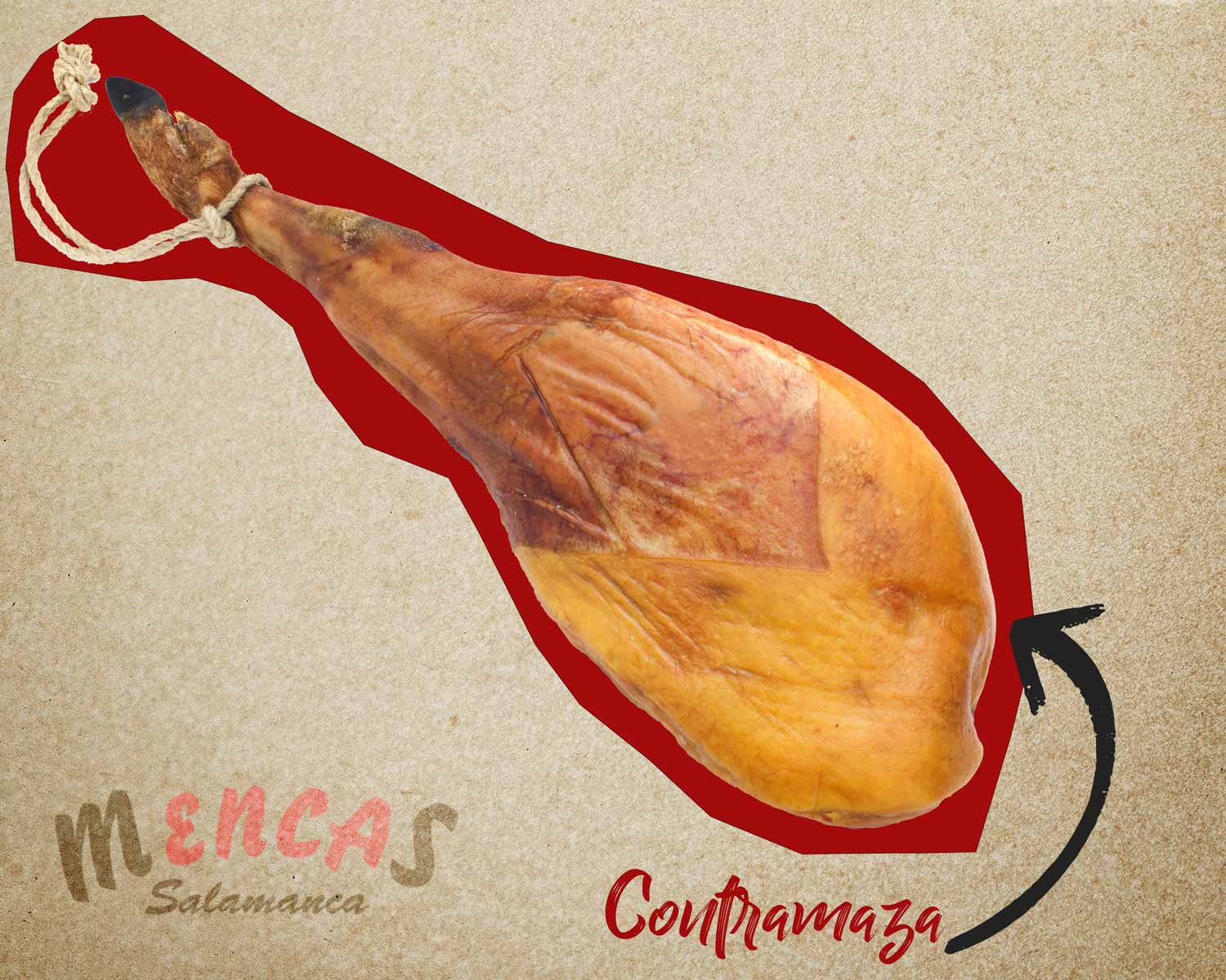 Justo en el lado opuesto a la maza se encuentra la contramaza, también conocida como cara posterior del jamón. Tiene una textura más firme y un menor contenido graso, pero conserva un sabor concentrado y ligeramente más salino.