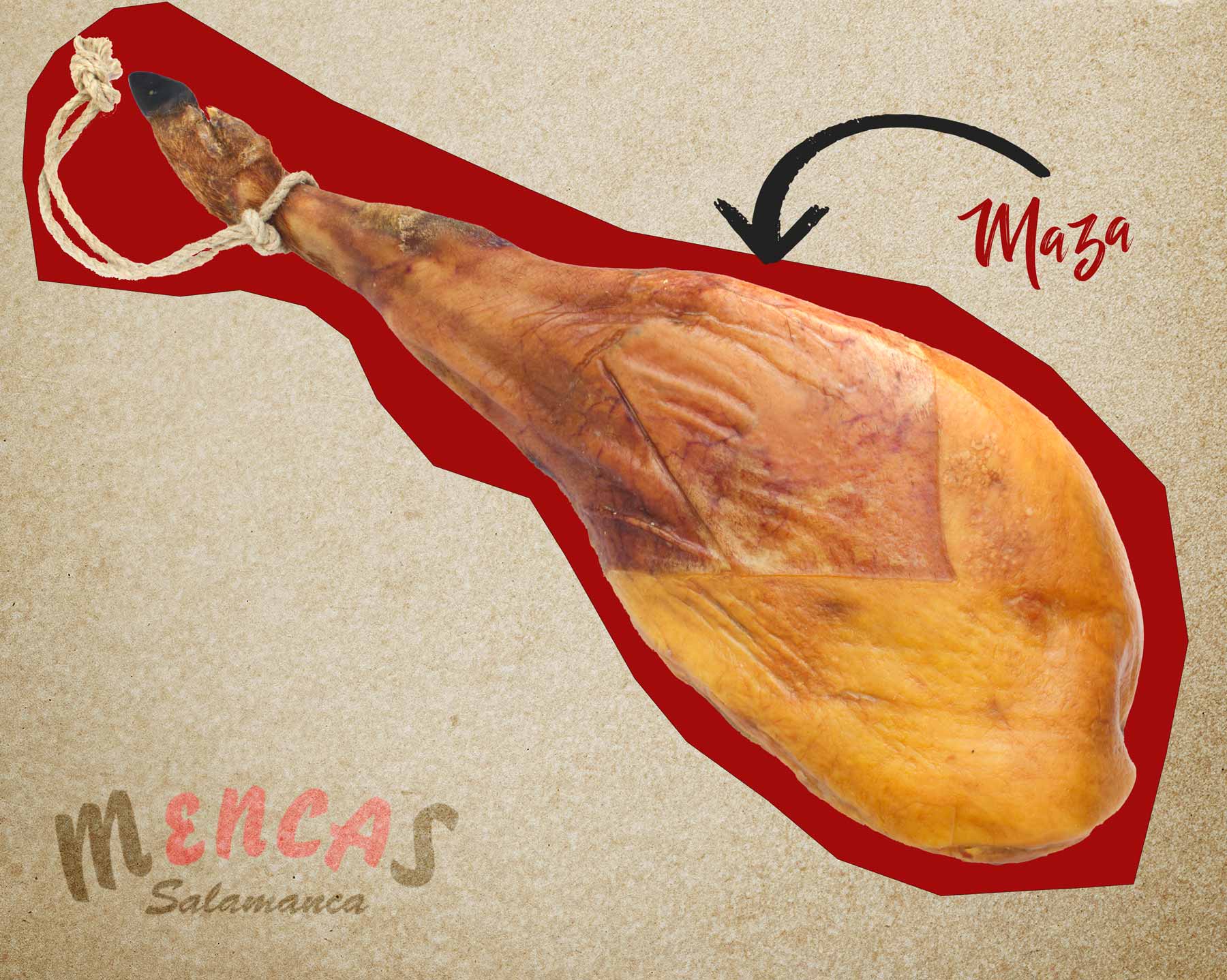 La maza es la parte más ancha y jugosa del jamón. Se encuentra en el lateral exterior y es la que concentra la mayor cantidad de grasa infiltrada, responsable del sabor intenso y la textura melosa del jamón ibérico.