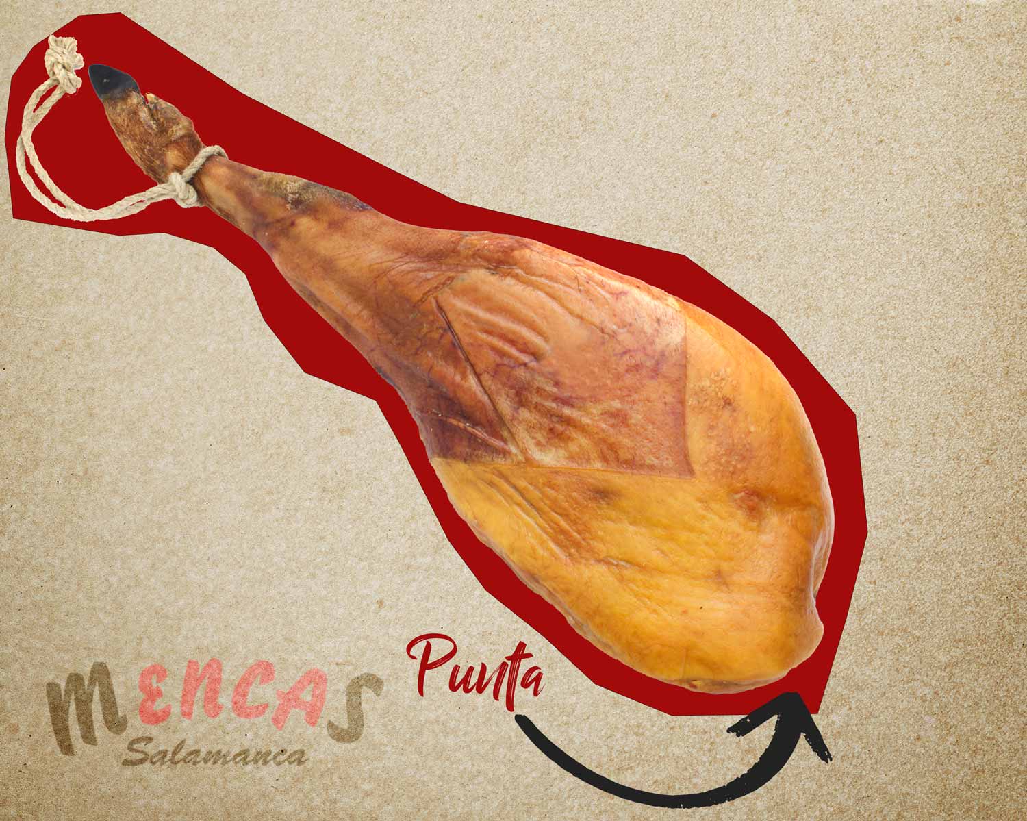 La punta se ubica en el extremo opuesto a la pezuña y es una de las zonas más sabrosas del jamón ibérico. Contiene más grasa infiltrada y una alta concentración de aromas, lo que le confiere un gusto profundo y ligeramente dulce.